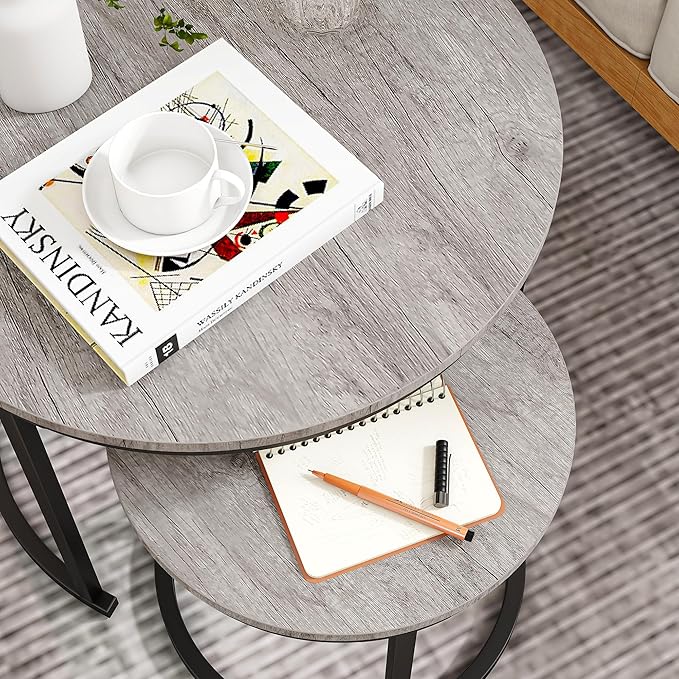 Round Coffee Table Set of 2 for Living Room,Black Small Coffee Table Living Room,Nesting Tables Metal Frame/Wood,Sturdy/Easy Assembly,Stacking Side Tables Bedroom,Grey