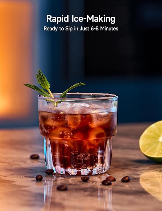 - Get Ice within 6-8Mins, 2 Ice Sizes: The HiCOZY D5’s high-efficiency system only takes 6-8mins to produce the first batch of 9 ice cubes. It can produce up to 26lbs per day with 2 ice sizes to choose from. The small ice rapidly cools drinks for a quick chill and the big ice melts slowly for a longer-lasting chill.