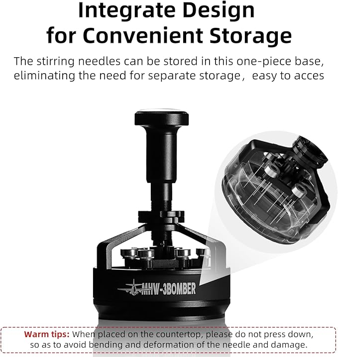 - 【Adjustable Needle Height】Adjust the needle depth to match your basket's capacity by rotating the adjustment ring. NOTE: If the needle doesn't reach the bottom of the basket, don't worry. The centrifugal force created during the wdt tool's rotation will disperse any untouched coffee grounds, which will not affect the taste of the coffee.