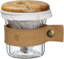 Load image into Gallery viewer, ATHIA glass pour over coffee maker set, minimalist drip coffee maker with reusable cloth filter, glass coffee dripper, olive lid & leather sleeve for single cup manual brewing (Olive Wood)
