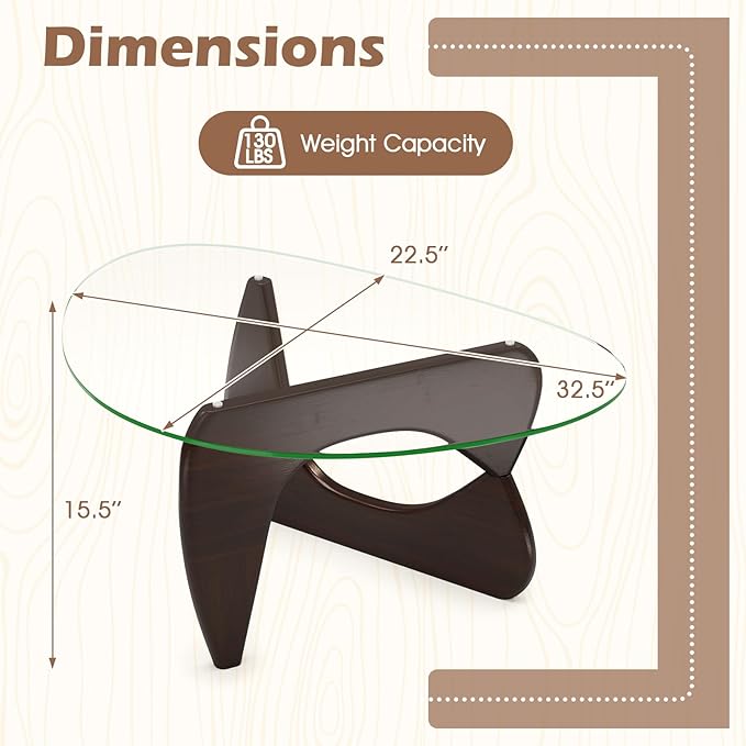 Giantex Triangle Glass Coffee Table, Solid Wood Tea Table with Tempered Glass Top & Adjustable Base, Small Accent Table for Small Spaces, Mid Century Modern Center Table for Living Room (Walnut)