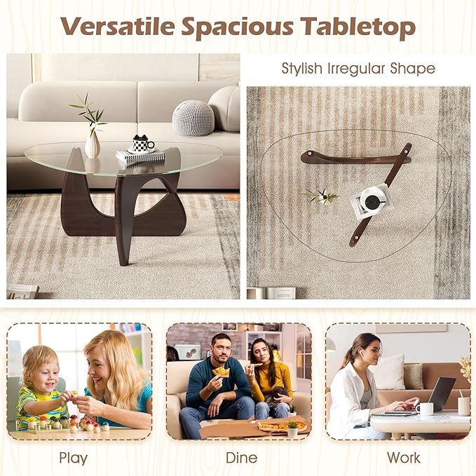 - [Modern Minimalist Design]: This coffee table boasts a contemporary look with a rounded triangle tabletop and an irregular shaped frame, making it an ideal addition to any living room, office lounge, or modern space. The transparent top goes well with different furnishing styles.