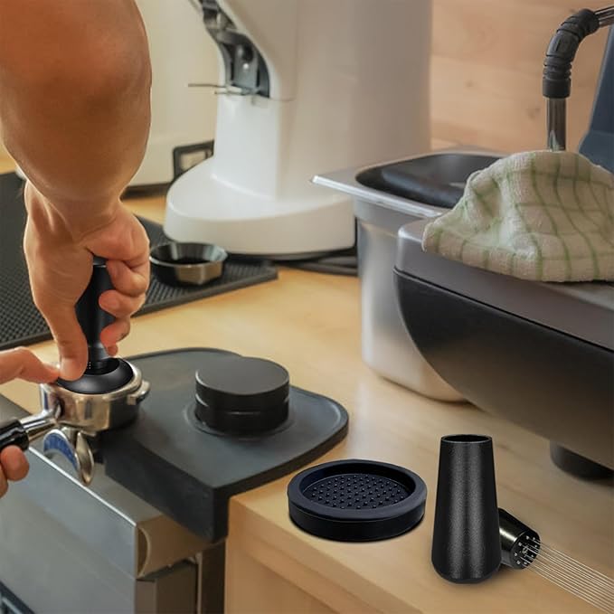 - Tamper pad and WDT tool-The coffee tamper set includes a silicone tamper pad and a 304 stainless steel espresso dispensing tool. The silicone mat protects your countertop and espresso tamper from potential damage, and also traps coffee grounds from the base of the tamper, keeping your countertop clean and tidy. In addition, the stainless steel espresso tamper improves the quality of your coffee making by evenly and loosely mixing the grounds.
