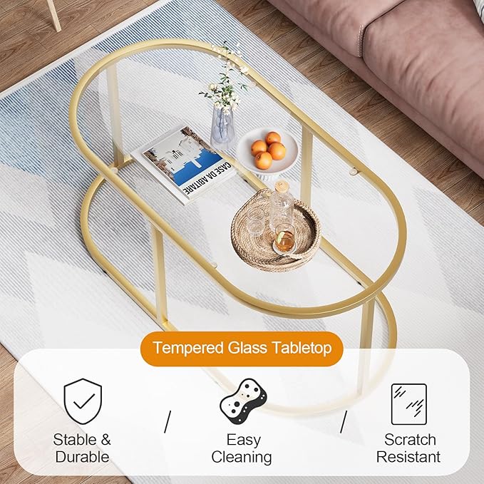 - 【UNIQUE & ELEGANT】The oval coffee table with modern design, clear solid glass top with gold metal frame, adding a touch of beauty and elegance to your living room or office.