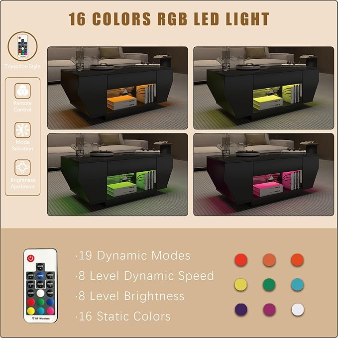 - Black LED Coffee Table with 16 Colors Lights: This LED modern living room center table is equipped with 16 colors light strip & remote control. You can easily stick it under the LED coffee table, which is a perfect ornament to create a romantic, relaxed & cheerful atmosphere by changing the color. This black LED coffee table has 4 lighting patterns with 16 kinds of changing color LED lights with USB connector & remote control ON/OFF.