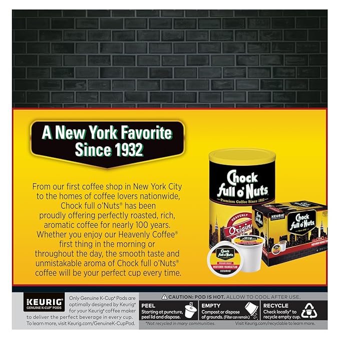 - PREMIUM ARABICA - Chock full o’Nuts single serve coffee cups are a rich blend of premium Arabica coffee beans that have been roasted to perfection. Each cup delivers a delicious flavor and the unmistakable aroma of Chock full o’Nuts.