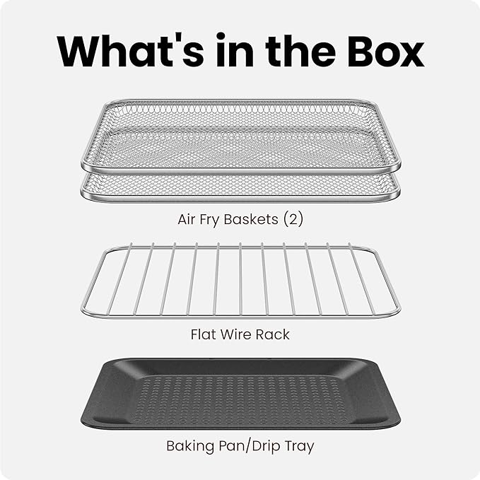 - ACCESSORIES INCLUDED: Your small toaster oven comes with air fryer accessories for any meal, including two air-fry baskets, a flat wire rack, and a baking pan/drip tray.