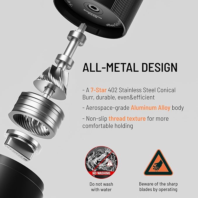 - [ALL-METAL DESIGN] This Electric Coffee Grinder features a fully metallic aluminum alloy structure with no plastic components inside, making it easy to clean and eliminating the risk of plastic residue in your coffee. More safety, valuable and durable than normal grinder. Non-slip bottom pad protects from easy fall-down.