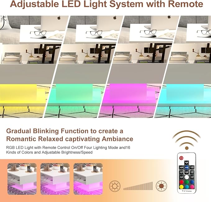 - 【What You Get】1 HedoAjim Coffee Table with Lift Top Featuring 16 colors, brightness settings, light patterns, and remote control, All necessary hardware and tools for assembly, and Easy-to-follow assembly instructions. If you have any questions, please contact us, we will response within 24 hours, we will give you a great solution.