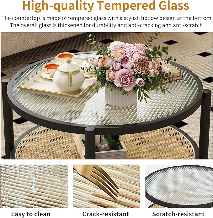 - Sturdy Solid Wood Frame:This glass coffee table is crafted from solid wood, rattan, and tempered glass.The 0.6 in glass is anti-scratch and anti-burst for excellent weight capacity, and stands the test of time as a truly safe and durable storage coffee table