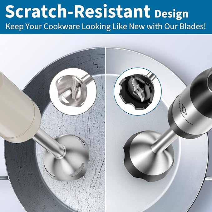 - SCRATCH PROTECTION: The food-grade blade guard prevents scratching your cookware while reducing suction and splashing. Keep your kitchen clean and make cleanup effortless with this immersion blender handheld.