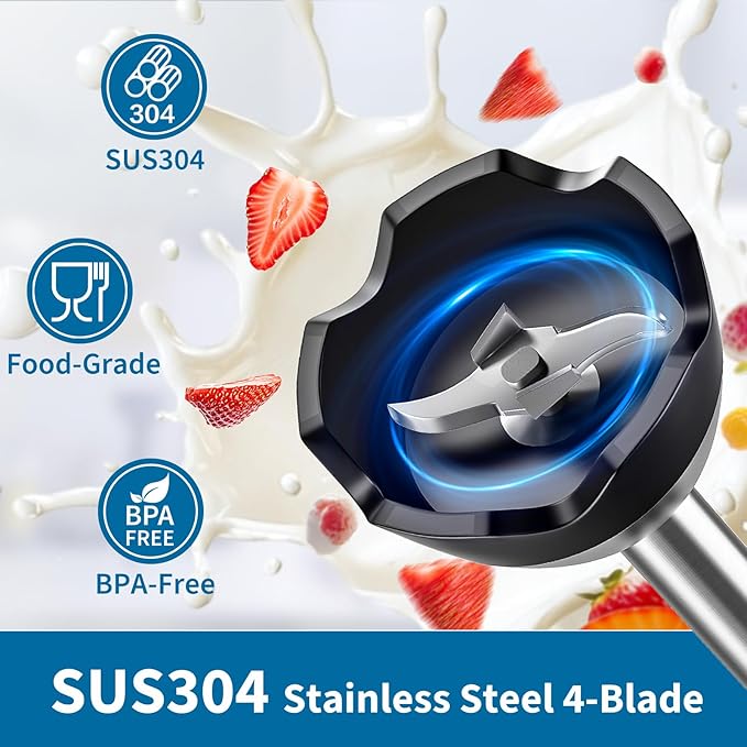- 4-IN-1 HANDHELD IMMERSION BLENDER SET: This powerful immersion blender handheld comes with a stainless steel 4-leaf blade, stainless steel horn knife, 1000ml chopper, and storage rack. Perfect for quickly preparing a variety of foods with ease.