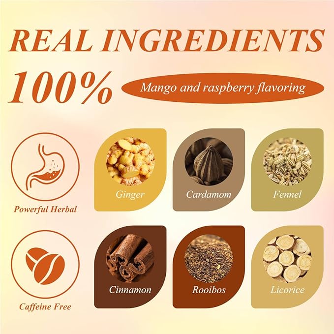 - 【Powerful Herbal Blend】Mango Ginger Tea is perfect blend of ginger, cardamom, fennel, cinnamon, rooibos, licorice, mango flavor, raspberry flavor. Caffeine-free Herbal Tea!
