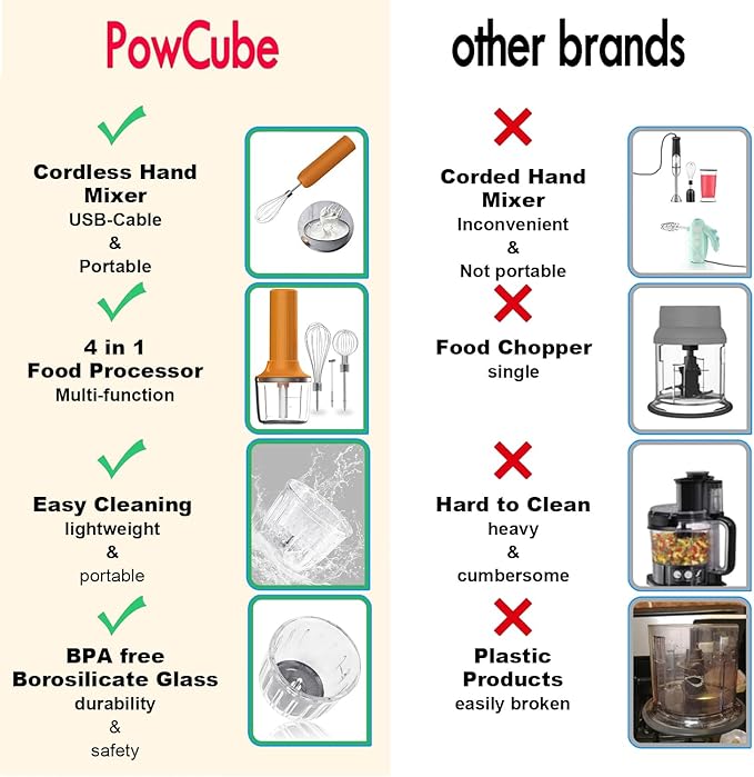 - USB Rechargeable & Portable: PowCube hand mixer features a 2000mAh lithium battery. Fully charged, this milk frother powers up to 40 uses and includes an auto shut-off after 2 minutes of continuous use to prevent overheating and can be easily restarted by pressing the power button for 2 seconds. Perfect for milk frother,chopping vegetables or whipping cream, this cordless hand mixer is not suitable for mixing a heavy batter for making cookie. Enjoy mixing anywhere, anytime!