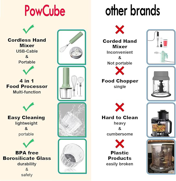 - USB Rechargeable & Portable: PowCube hand mixer features a 2000mAh lithium battery. Fully charged, this milk frother powers up to 40 uses and includes an auto shut-off after 2 minutes of continuous use to prevent overheating and can be easily restarted by pressing the power button for 2 seconds. Perfect for milk frother,chopping vegetables or whipping cream, this cordless hand mixer is not suitable for mixing a heavy batter for making cookie. Enjoy mixing anywhere, anytime!