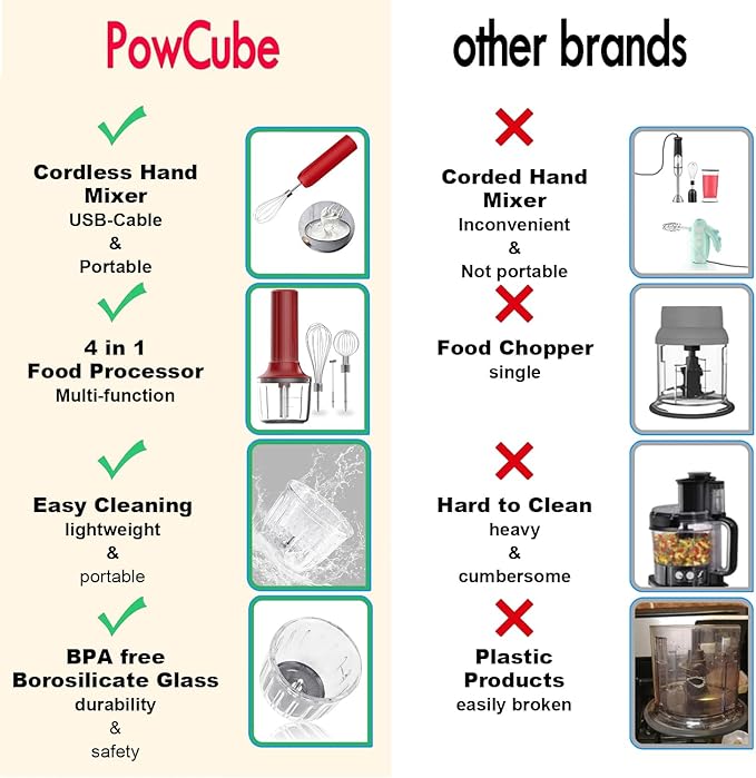- USB Rechargeable & Portable: PowCube hand mixer features a 2000mAh lithium battery. Fully charged, this milk frother powers up to 40 uses and includes an auto shut-off after 2 minutes of continuous use to prevent overheating and can be easily restarted by pressing the power button for 2 seconds. Perfect for milk frother,chopping vegetables or whipping cream, this cordless hand mixer is not suitable for mixing a heavy batter for making cookie. Enjoy mixing anywhere, anytime!