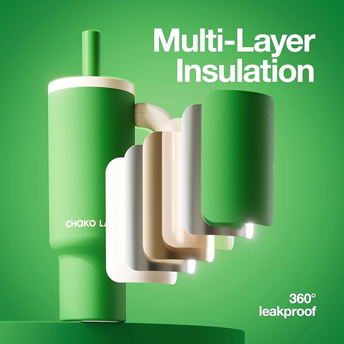 BaWang Insulated Stainless Steel Tumbler | Tumbler with Handle and Straw 33oz | Cup Holder Friendly for Travel | Leakproof Water Bottle | BPA-Free | Ceramic liner| Green&White