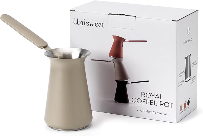 - STAINLESS STEEL MATERIAL: Crafted from high-quality food-grade 304 stainless steel, this Stainless Steel Turkish Coffee Pot is built to last. It’s rust-resistant, easy to clean, and withstands high temperatures without deformation. The ergonomic rubber handle ensures a comfortable grip and protects against burns, making it a safer choice compared to traditional copper Turkish coffee pot designs
