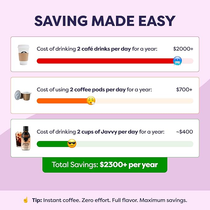 - Insane Value – Each bottle contains up to 35 servings of coffee concentrate which is 3x more servings than our competitors. With Javvy Coffee, you're only spending less than $1/cup meaning you get to enjoy premium specialty coffee every day without breaking the bank!