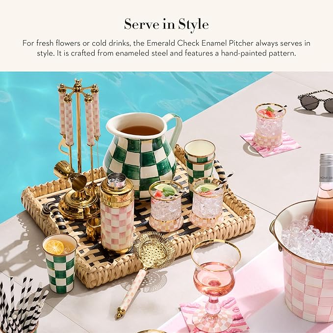 MACKENZIE-CHILDS Enamel Pitcher with Spout for Water, Cut Flowers, and Home Decor, 3 Quarts, Green-and-White Emerald Check
