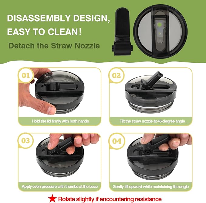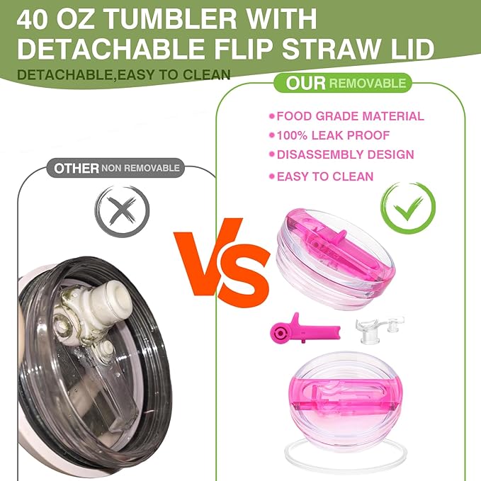- 1. Detachable Flip Straw Lid with 100% Leakproof Design – This tumbler features a unique flip straw lid that can be easily removed for cleaning, ensuring 360° thorough cleaning. The 100% leakproof design of the flip-up straw lid allows you to drink anytime, anywhere, without worrying about spills or leaks. Whether it’s in your bag or car, it stays clean and leak-free, making it safe and convenient to carry.