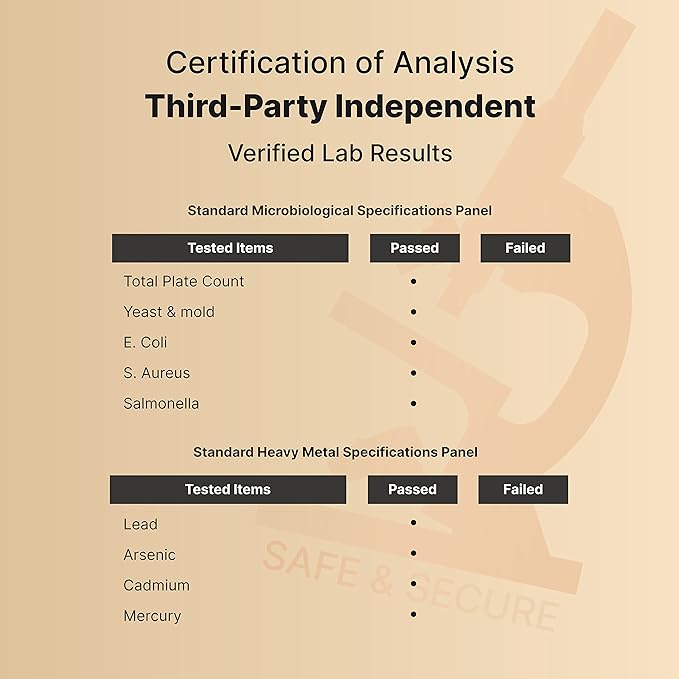 - 3rd party lab tested. Not exposed to radiation and does not contain GMOs, gluten, soy, dairy, fish, preservatives, or fillers.