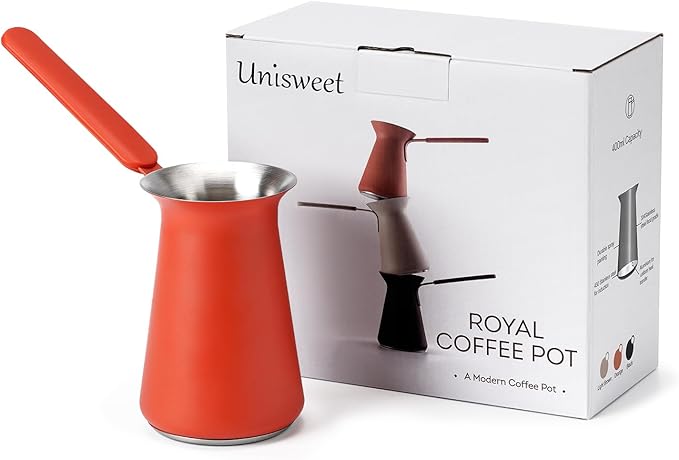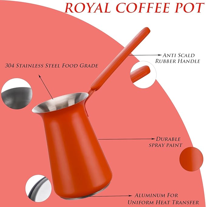 - STAINLESS STEEL MATERIAL: Crafted from high-quality food-grade 304 stainless steel, this Stainless Steel Turkish Coffee Pot is built to last. It’s rust-resistant, easy to clean, and withstands high temperatures without deformation. The ergonomic rubber handle ensures a comfortable grip and protects against burns, making it a safer choice compared to traditional copper Turkish coffee pot designs