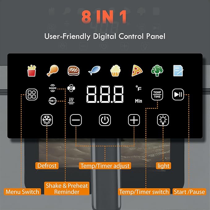 - 8-in-1 Multi-Preset Functions for Ultimate Versatility: From air frying and roasting to baking, broiling, dehydrating, and reheating, this 7.5Qt air fryer does it all! With 8 preset functions, you can effortlessly create crispy fries, juicy meats, healthy snacks, and even dehydrated treats—all with the touch of a button.