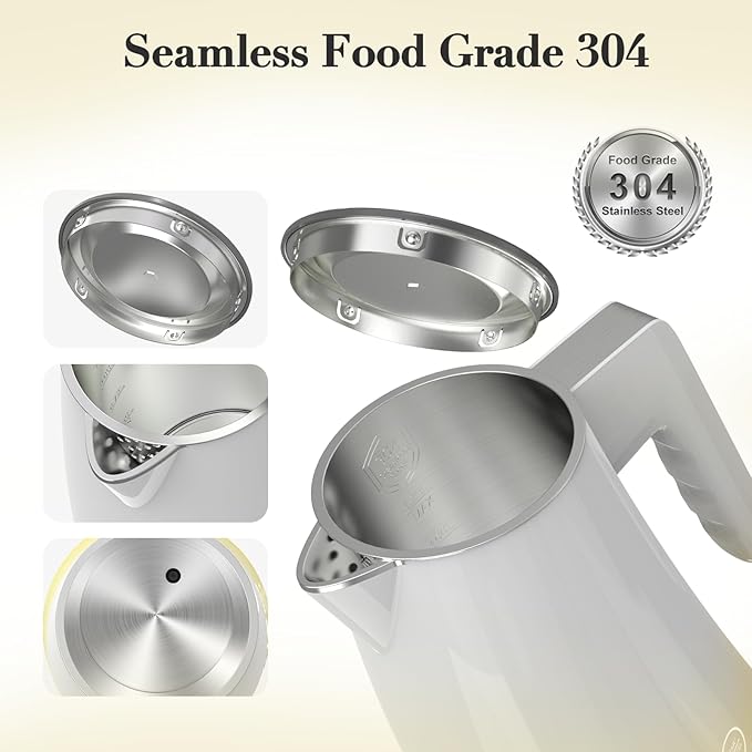 - 【REMOVABLE LID AND STAINLESS STEEL LINER】Electric kettle is made of double-layer construction, and all the parts that come into contact with water are food-grade 304 stainless steel. BPA free.