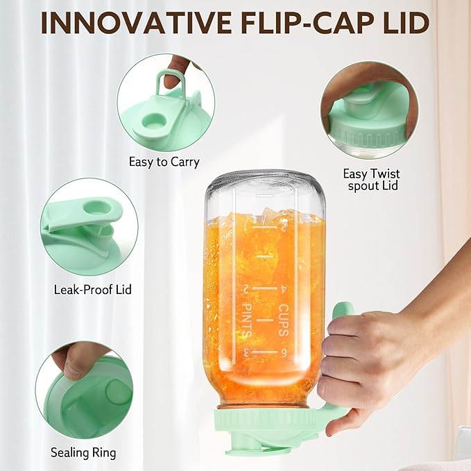 - [Leak-Proof & Spill-Proof]:Our 32 oz mason jar pitcher boasts a unique flip-cap lid with a leak-proof sealing gasket and a securely sealed cover, ensuring the freshness of your favorite beverages while also preventing any leaks. It is designed for easy and convenient opening, pouring, and closing, making it perfect for transporting your drinks.