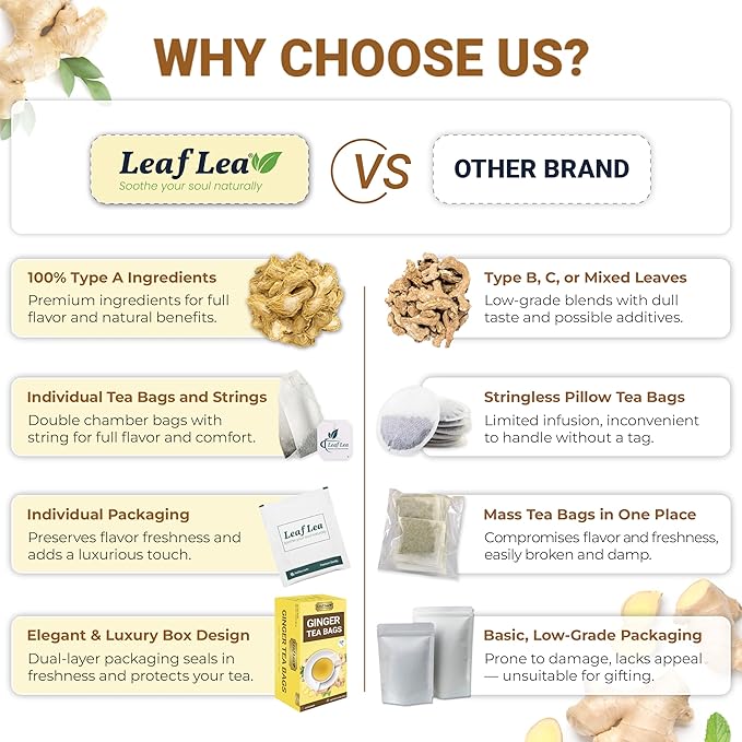 LeafLea 120 Ginger Tea Bags, 100% Pure Ginger Root Herbal Tea, Spicy & Warming Flavor, Supports Digestion & Immune Health, Individually Wrapped, Caffeine-Free, Sugar-Free, Gluten-Free, Non-GMO, Vegan