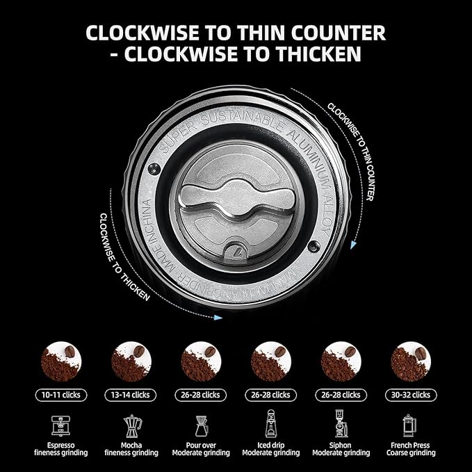 - 【ADJUSTABLE GRINDING FINENESS】 - Built-in grinding adjustment knob, with more than 56 click settings, turn the grinding knob to get the desired coffee grinding fineness, you can enjoy wonderful coffee time in your home office or outdoor camping, vacation, such as espresso .Americano .Latte . Coppuccino .Macchiato .Mocha .Pour over, drip. filter.French press , cold brew .etc.
