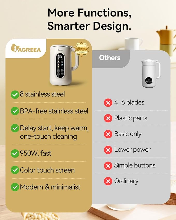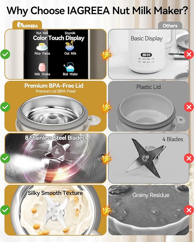 IAGREEA 8 in 1 Nut Milk Maker Machine Stainless Steel Lid BPA Free for Homemade Almond/Oat/Soymilk, 35 oz(1L) Almond Milk Maker Machine with 8 Mins Self-Cleaning, 2 hrs Keep Warm, 750W Stirring Power