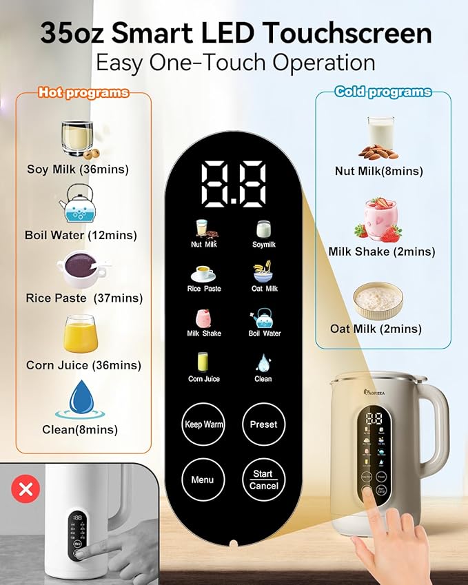 - ②One-Touch Operation&No Soaking Needed: Automatic heating and filtering-free design–No need to soak ingredients in advance, just add ingredients, press a button, and enjoy fresh soy milk in 36 minutes. Both hot and cold drinks can be made through different programs.