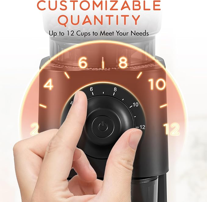 - Customizable Quantity: Coffee bean grinder with 2-12 cup quantity selection settings to grind the exact quantity you need