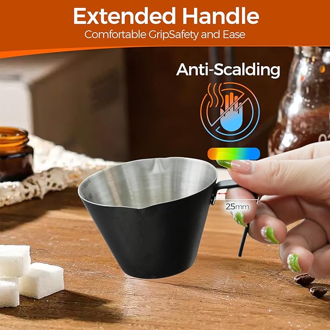 - Ergonomic Handle for Easy Grip & Anti-Scalding:The stainless steel measuring cup has an ergonomic handle for a secure,comfortable grip.Itโs safe for hot espresso or freshly whipped milk,ensuring your hands wonโt get burned while you enjoy your coffee
