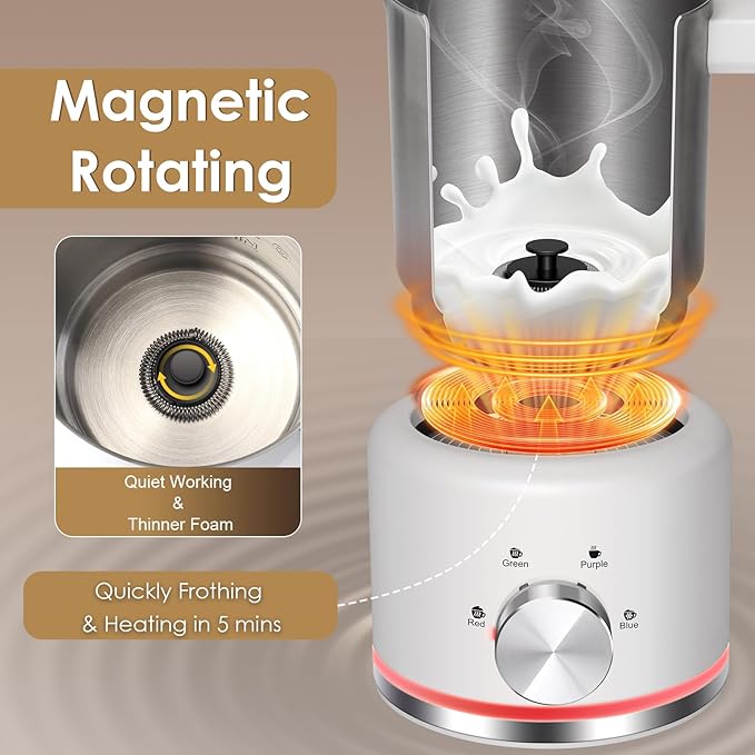 - ššš š§ššš¢š ššØšššš¢š§š šššš”š§šØš„šØš š²-The rotating whisk inside the milk frother electric's container to spin and agitate the milk, introducing air and creating foam, that makes stable and consistent frothing what brings consistent agitation, the milk foamer for coffee ensures the foam tinier than other traditional milk frother. Compared to other milk frother, the magnetic rotation technology minimizes the friction between the whisk and the container, improving durability, and making the frother run more quietly.