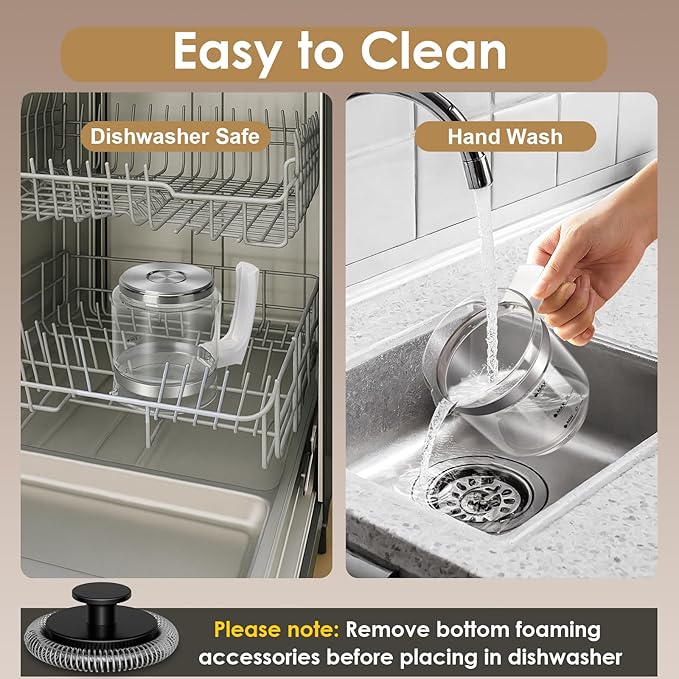 - The carafe of milk frother is separable from base, you can soak the carafe into the water or wash it by using dishwasher.