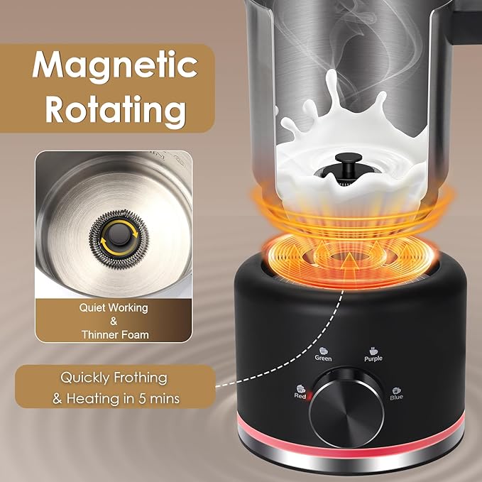 - ššš š§ššš¢š ššØšššš¢š§š šššš”š§šØš„šØš š²-The rotating whisk inside the milk frother electric's container to spin and agitate the milk, introducing air and creating foam, that makes stable and consistent frothing what brings consistent agitation, the milk foamer for coffee ensures the foam tinier than other traditional milk frother. Compared to other milk frother, the magnetic rotation technology minimizes the friction between the whisk and the container, improving durability, and making the frother run more quietly.
