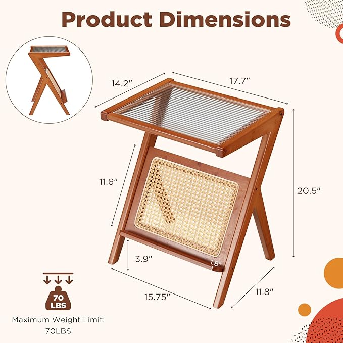 - 【Detachable tempered glass】The detachable tempered glass tabletop is not only elegant, sturdy, and scratch-resistant, but also easy to clean. Moreover, its spacious surface is ideal for placing your laptop, cups, decorations, etc. It can serve various functions, such as a desk, bamboo nightstand, boho coffee table, rattan end table, and other functional tables