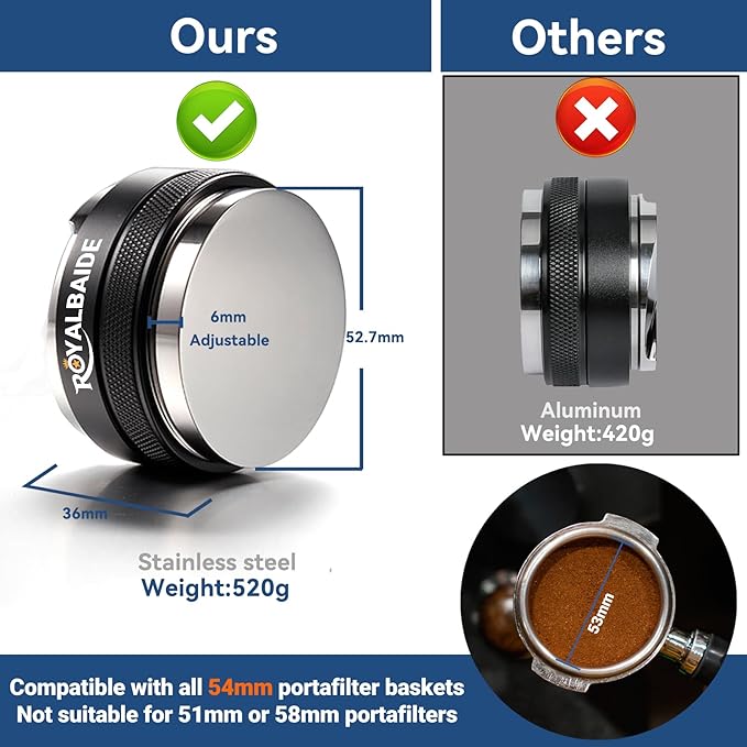 - 【304 Stainless Steel Material】ROYALBAIDE coffee distributor/tamper base is made of 100% food-grade stainless steel, ensuring safety,health, and easy cleaning. We adhere to the design philosophy of quality, functionality, and user experience, with the handle crafted from stylish and durable high quality aluminum alloy. It conforms to ergonomics, providing you with a stable and comfortable gripping experience and an excellent tactile sensation.