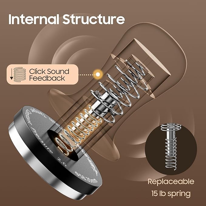 - Constant Pressure: This 58mm tamper is designed with 3 springs to maintain a constant pressure of 30 pounds without adjustment for even tamping. It has been tested with 30 pounds of constant force, which helps improve the flavor and stability of espresso coffee when extracted. We also offer a 15 pound spare spring that is perfectly suited to your tamping needs.