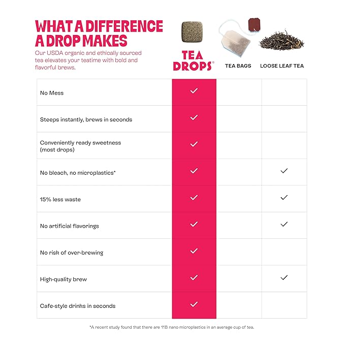 - LOOSE LEAF TEA WITHOUT THE FUSS: Simply add a Tea Drop in hot water, and be on your way. No need to wait for your tea to seep or deal with a drippy tea bag; it’s easy, on the go, environmentally friendly, bagless tea