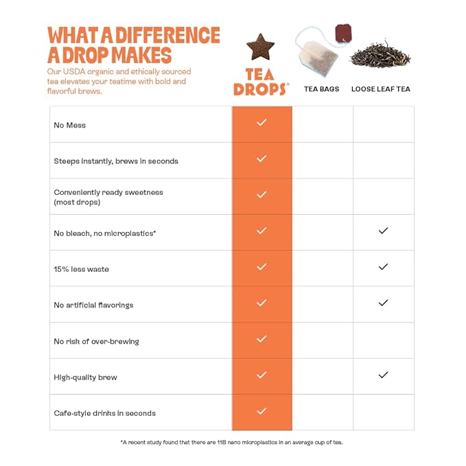 - LOOSE LEAF TEA WITHOUT THE FUSS: Simply add a Tea Drop in hot water, and be on your way. No need to wait for your tea to seep or deal with a drippy tea bag; it’s easy, on the go, environmentally friendly, bagless tea