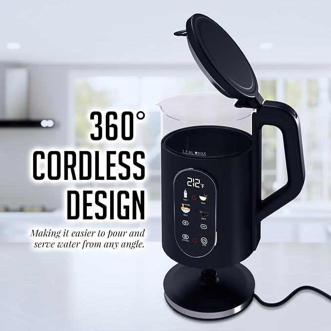 - UNLOCK THE ART OF BREWING – Elevate your brewing experience with our 1500-watt double-wall electric kettle, featuring a 1.7L capacity. Designed for precision, it offers 5 specialized temperature settings to perfect your tea, coffee and culinary creations. Savor the art of brewing at its finest, with every sip perfectly tailored to your taste.