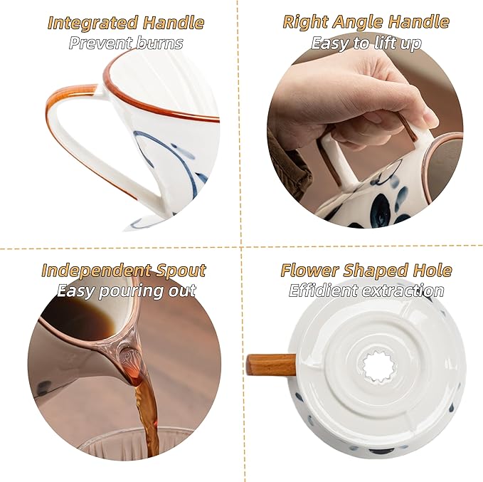- Strong And Pure:Thanks to the natural characteristics of ceramics, ceramic coffee pots are stronger and more durable than glass coffee pots, not only with excellent thermal insulation, maintain a stable brewing temperature, but also more durable.
