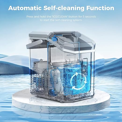 - 【Self-cleaning and Easy to Use】With just one button, this countertop ice maker is easy to use and control. Fill the ice maker with water, press the 'ICE/CLEAN' button and that's it. The "ADD WATER" indicator turns on when the ice maker is lack water and the "ICE FULL" indicator turns on when the ice basket is full. Just press 'ICE/CLEAN' button for 5s to enter self-cleaning function, which makes maintenance a breeze