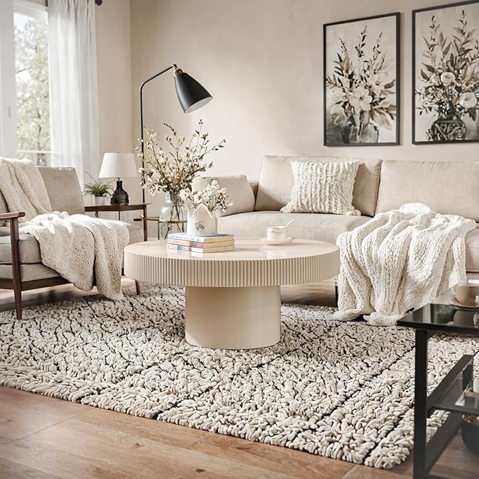 Handmade Wooden Drum Coffee Table、Elegant Round Fluted Wood Coffee Tables、Rustic Modern Circular Centerpiece for Living Room & Farmhouse Decor (A White 30.7in)