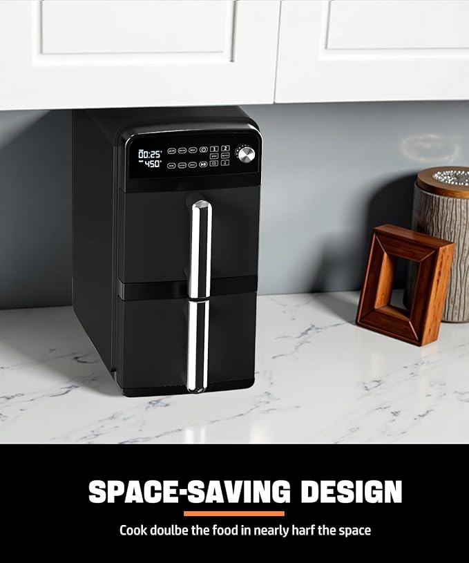 - 【Dual-Layer Vertical Design – Save Counter Space】Features 2 independent 6QT baskets stacked vertically to cook more food at once while saving space—perfect for big families or hosting.