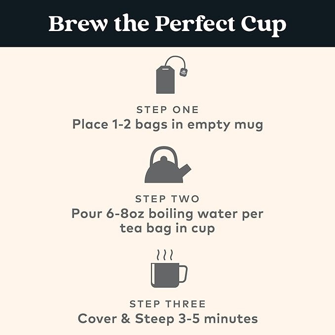 - HOW TO BREW: Place 1–2 teabags in a mug. Add 6–8 oz of boiling water per bag. Cover and steep for 3–5 minutes. Enjoy on its own or customize with milk and sweetener